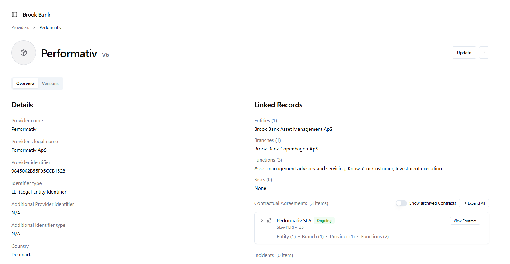 Efficiently add, search for, and manage third-party service Providers. View Contracts, Risks, and Incidents related to a Provider for an overview of their impact on the ICT network, meeting DORA’s requirements for managing relationships and maintaining operational resilience.