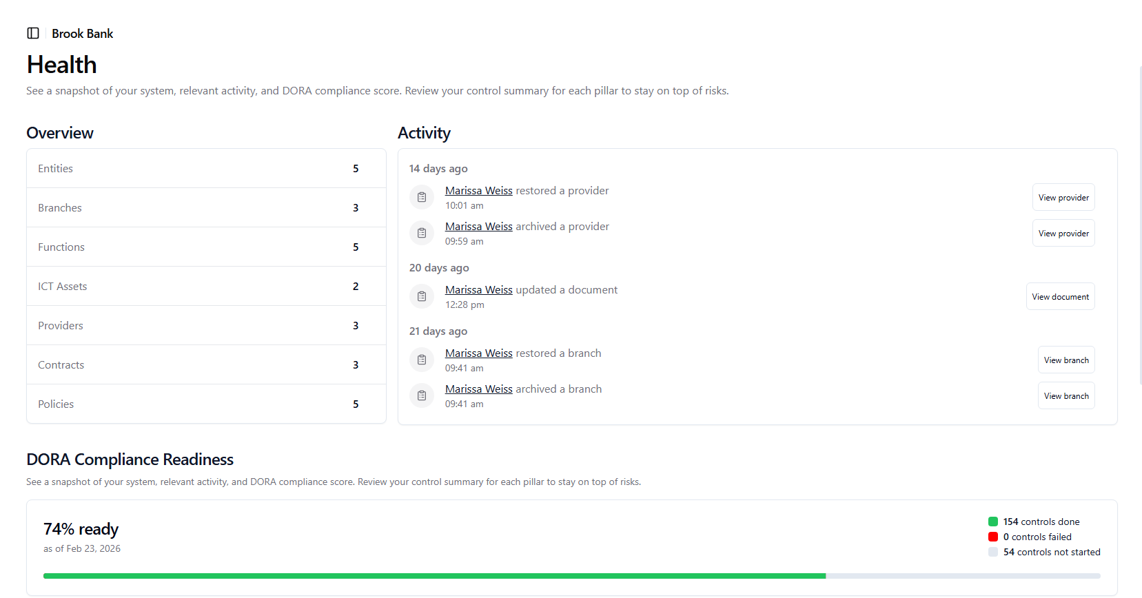 Stay on top of your organization’s DORA compliance operations via the interactive Health Dashboard. Featuring easy-to-monitor widgets, quickly capture your organization’s total regulatory compliance in real-time, with drill-down capabilities to easily track and address noncompliance.