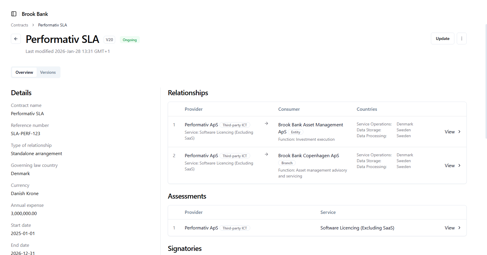 Easily manage Contracts with version control on the Contracts page, ensuring compliance with DORA’s reporting requirements for Contractual relationships with service Providers. Importing and exporting tools streamline adding and updating Contract details on an ongoing basis.