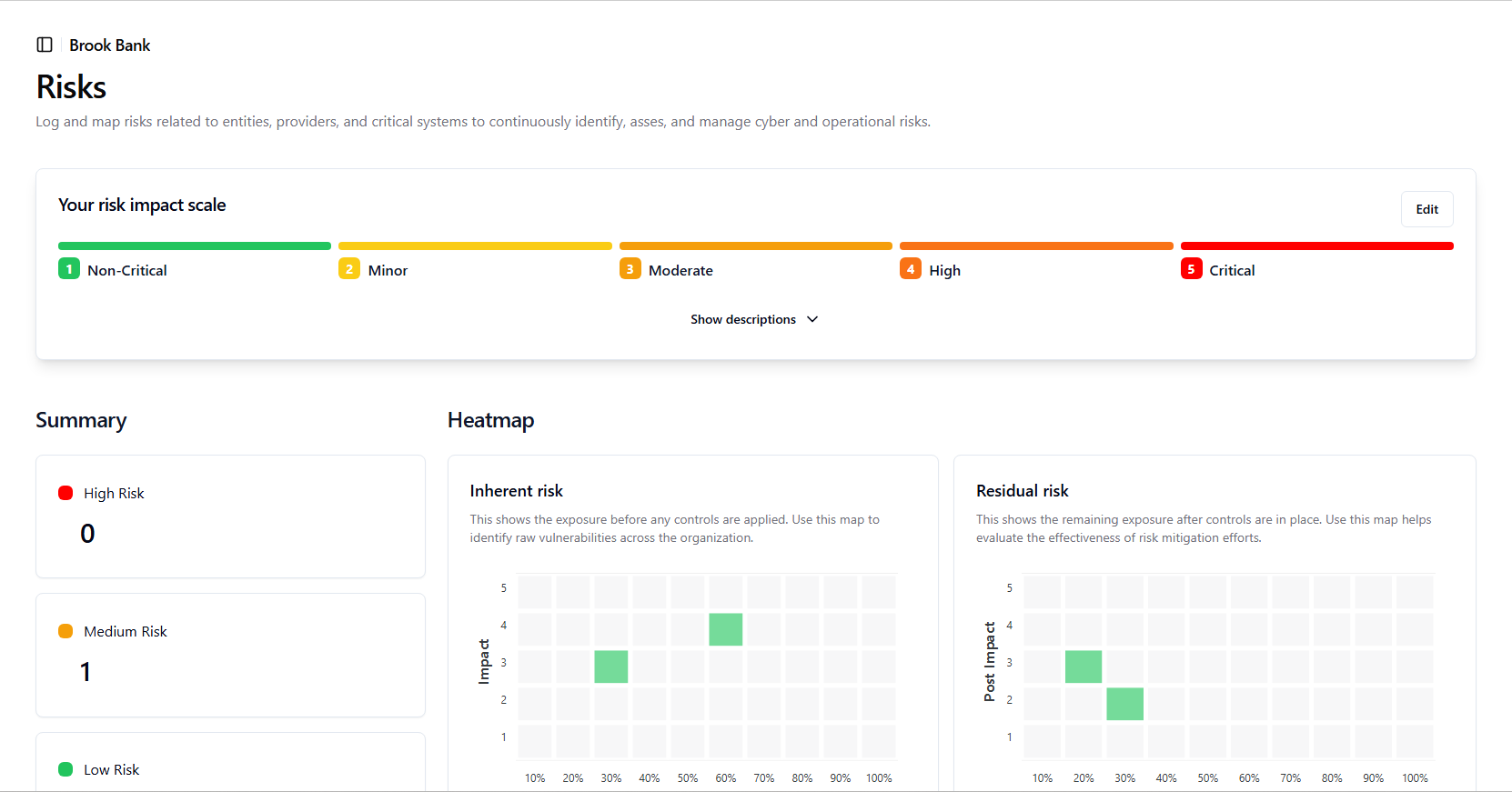 Proactively identify individual risks, and visualize them in aggregate within intuitive Risks dashboards, enabling continuous monitoring and mitigation. Tailored to meet DORA’s ICT risk management framework, this feature allows you to add, edit, and assess risks across your digital operational supply chain network. Each risk has its own, dedicated details page for in-depth analysis, helping you stay ahead of disruptions.