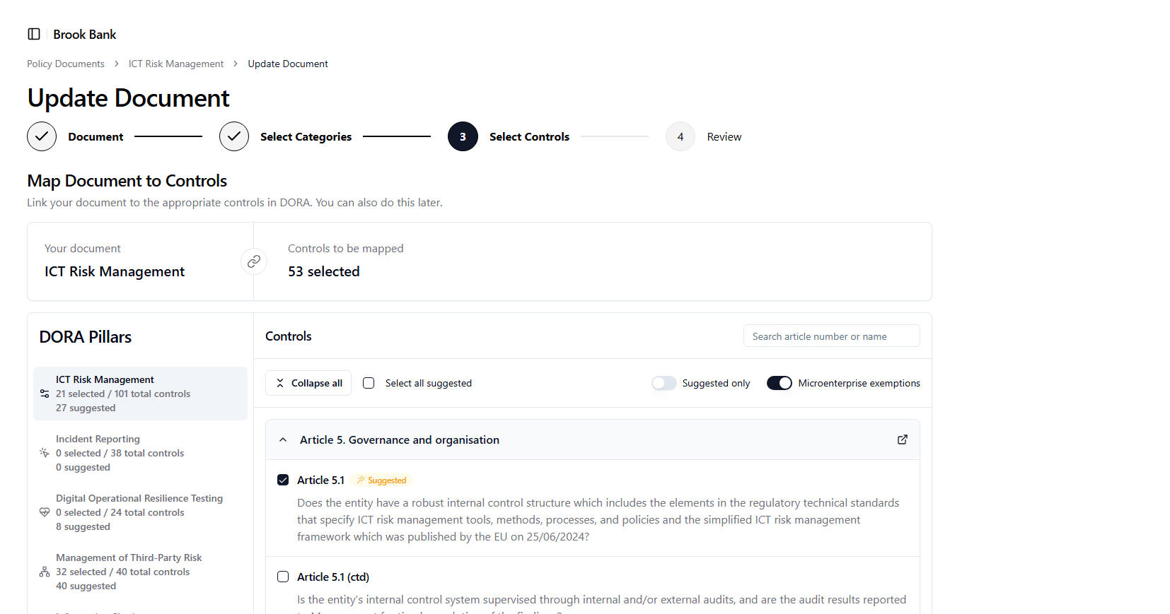 Easily upload and manage critical documentation such as policies, procedures, and protocols (to name a few). Our proprietary control library enables risk and compliance teams to easily link policy documentation to regulation and efficiently meet DORA’s extensive operational requirements. Notifications ensure that documents are reviewed and approved within the stipulated timeframes.