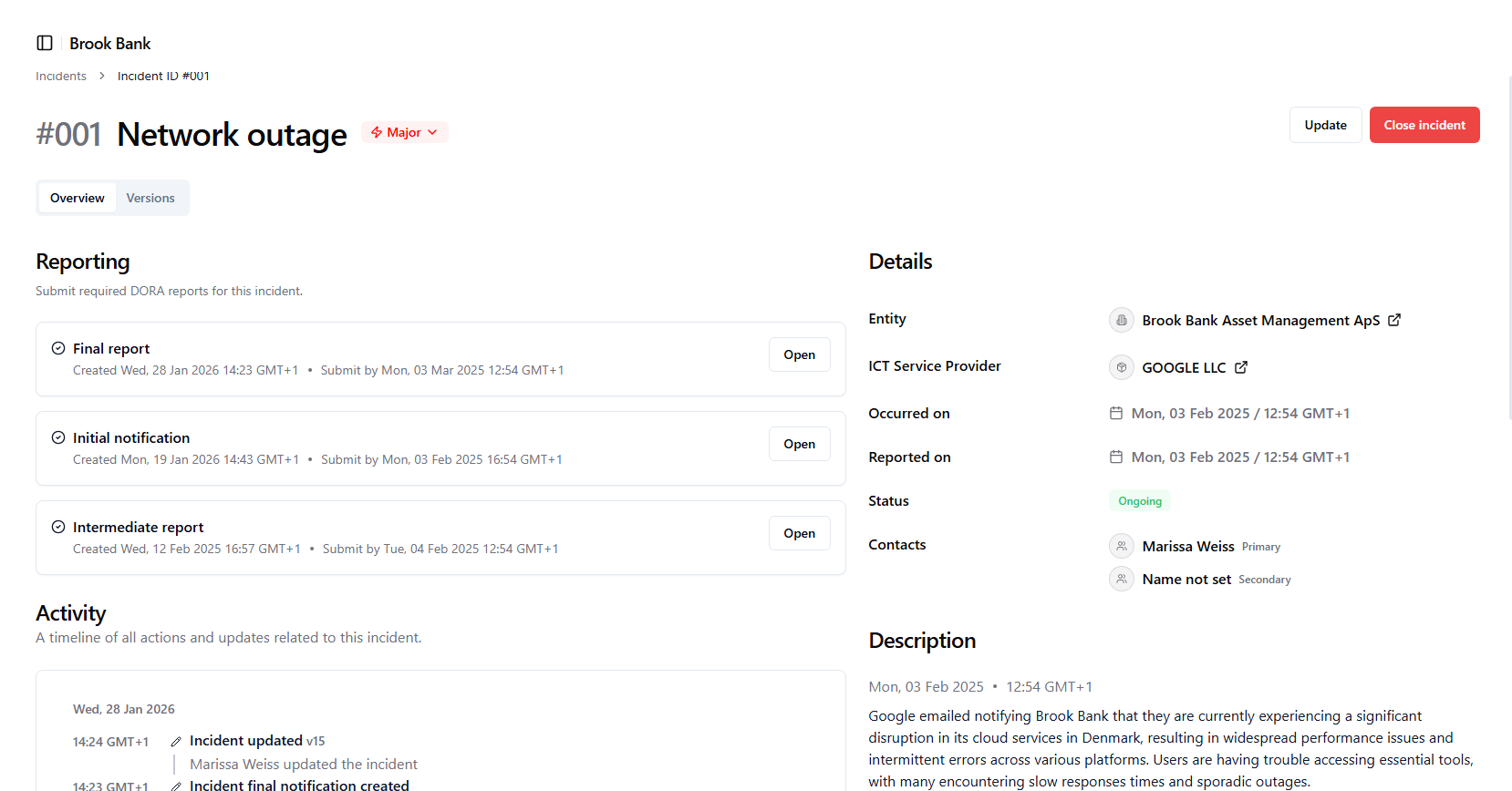 Our end-to-end Incidents workflow comprehensively drives the process from logging key incident details through to reporting on time, per DORA’s strict requirements. The module streamlines data collection, categorizes incident criticality and triggers notifications reporting. Risk and compliance teams can operate with confidence knowing that they can manage Incidents with speed and accuracy.
